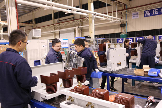 清明節(jié)前夕,國網(wǎng)湖南省電力公司湘潭九華北220kV變電站新建工程所需的48臺套KYN28柜已全面進入裝配攻堅階段。威勝電氣智能電氣成套事業(yè)部員工們干勁十足,凌晨3點,依舊堅守崗位奮戰(zhàn)在生產(chǎn)一線,銅排加工、產(chǎn)品裝配、質(zhì)量檢驗等崗位都緊張有序地忙碌著。
