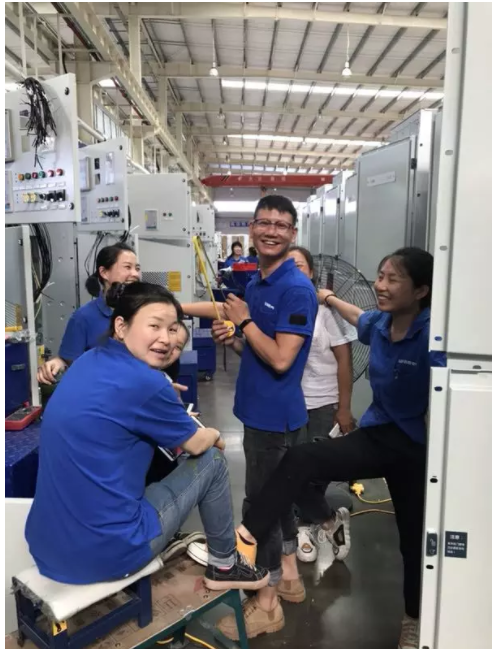 MV柜作為新產(chǎn)品項目,面對施耐德授權(quán)產(chǎn)品對品質(zhì)和工藝的高要求,殼體班組成員一絲不茍認(rèn)真對待,大家相互幫襯協(xié)作安全完成了任務(wù)。一次班組員工們在狹小的柜體空間里,蜷縮著身體一待就是好幾個小時,只為完成機構(gòu)調(diào)試及工藝整改要求。