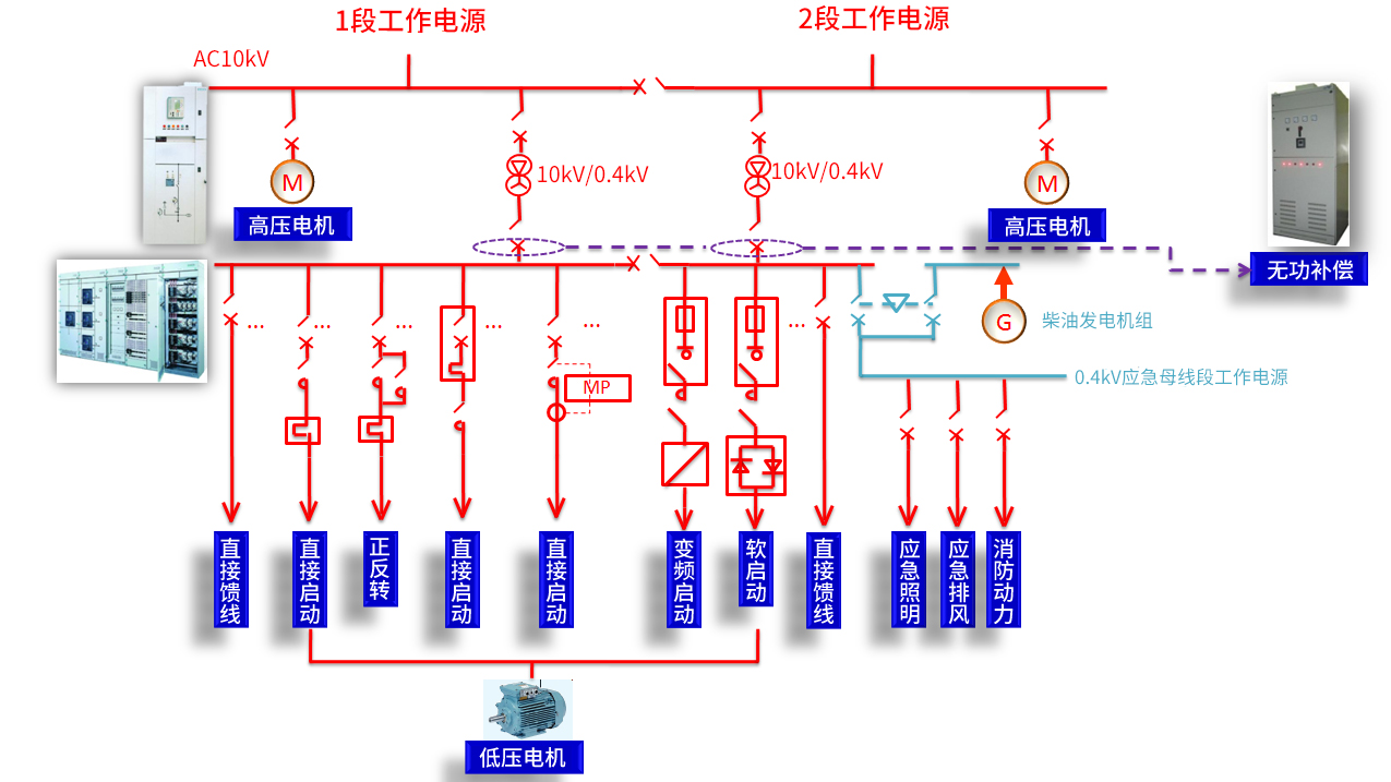 威勝電氣廠礦企業(yè)配電系統(tǒng)解決方案特別針對國內(nèi)廠礦企業(yè)中低壓10KV/0.4KV配電系統(tǒng)。一個雙回路電源進(jìn)線的高壓10KV配電所,正常供電時,分段隔離開關(guān)斷開,兩段母線分別車間變電所供電。在兩端母線上都皆有電壓互感器和避雷器,用于計量和防雷保護(hù)。低壓母線上接有補償無功功率的電容器,以提高工廠功率因數(shù)。廠礦企業(yè)配電解決方案根據(jù)電源以及電能輸送、分配、控制等一次設(shè)備之間的關(guān)系可供設(shè)備包含10KV開關(guān)柜、0.4KV開關(guān)柜及其配套相關(guān)配電設(shè)備。