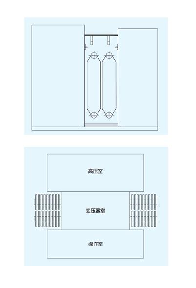 1、 箱變結構分為變壓器本體、高壓室、低壓室、檢測室、開關操作室和熔斷器室六個部分,可按“目”字型或“品”字型排列。