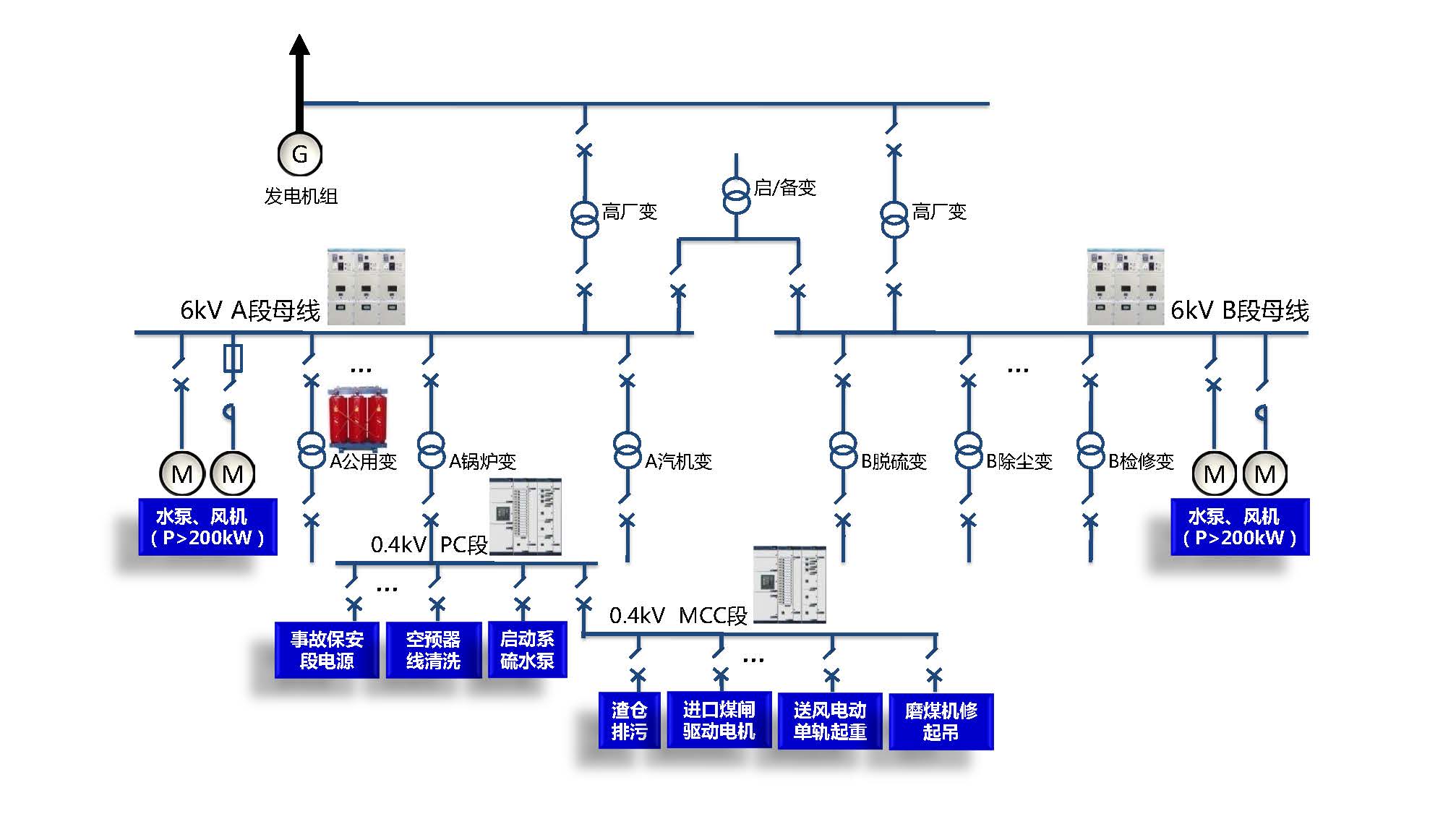 中壓系統通過中低壓廠用變壓器,供電給廠用電低壓動力設備和照明、檢修等。低壓廠用電系統通常采用動力中心PC、電動機控制中心MCC供電方式。對于PC和MCC供電,威勝電氣提供通過全型式試驗的西門子授權SIVACON 8PT低壓配電柜、施耐德授權Blokset低壓配電柜、MNS低壓配電柜,滿足低壓配電線路保護和電動機保護控制要求。