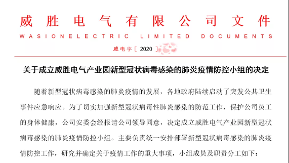 自疫情發(fā)生以來,威勝電氣成立以公司董事長為領(lǐng)導(dǎo)組組長的疫情防控小組, 健全決策高效、運(yùn)轉(zhuǎn)協(xié)調(diào)的指揮體系,公司高層靠前指揮,對防控工作親自部署、督辦,多次組織召開線上防控疫情工作會(huì)議。并先后發(fā)布《關(guān)于進(jìn)一步做好新型冠狀病毒感染的肺炎疫情防控工作的通知》等相關(guān)文件,對園區(qū)防疫和復(fù)工進(jìn)行全面部署,對出入園管控、環(huán)境衛(wèi)生、就餐管理、考勤辦公、宣傳引導(dǎo)等各項(xiàng)防控措施進(jìn)行細(xì)化并責(zé)任到人。