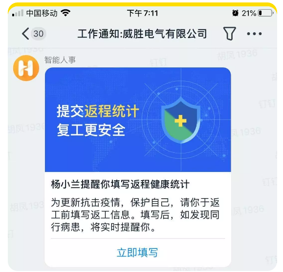 通過釘釘、微信群、電話等方式進(jìn)行日報(bào)備、日監(jiān)測、日排查,落實(shí)員工情況監(jiān)測、更新員工動(dòng)態(tài)與報(bào)備員工異常情況,凡14天內(nèi)由湖北返回的和與確診病人、疑似病例的密切接觸者,實(shí)施必要自我居家隔離措施。