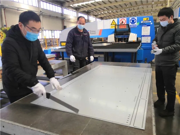 要完成任務,主要有兩大困難:一是需要緊急調配相關生產配套,尤其是如何在最短時間內協調核心元器件各項物料到位,實現有序銜接;二是在于如何在短時間內切實保障產品質量,做到生產的高效、精準。接到任務的第一時間,智能電氣成套事業部總經理黃水庚和技術部、生產部相關人員商討電氣產品方案,憑借標準化圖紙設計,完成圖紙繪制與技術資料下達工作。在完成車間現場消毒后,威勝電氣一線員工迅速到崗,一切工作都在緊張而有序的進行著。一次生產運營中心總監朱崇明全面部署生產、計劃、倉儲等交付鏈相關部門,全員武裝、全力投入生產。依靠高效、高質的流水線作業,目前,該2個項目完成了鈑金件自制、銅排設計、銅排制作等工序內容。