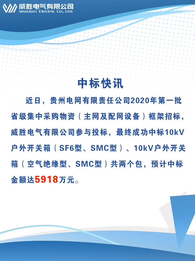 2020年4月22日,貴州電網(wǎng)有限責(zé)任公司2020年第一批省級集中采購物資(主網(wǎng)及配網(wǎng)設(shè)備)框架招標(biāo),威勝電氣有限公司參與投標(biāo),最終中標(biāo)10kV戶外開關(guān)箱(SF6型、SMC型)、10kV戶外開關(guān)箱(空氣絕緣型、SMC型),預(yù)計(jì)中標(biāo)金額達(dá)5918萬元。