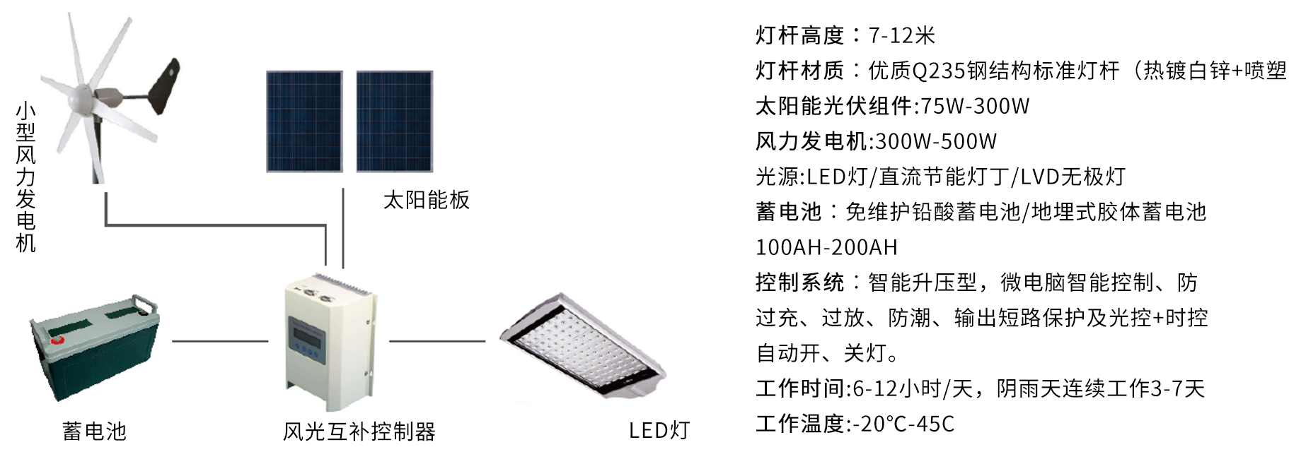 4、照明系統:照明燈具以低壓24V燈具為主,如節能燈、無極燈、LED燈、金鹵燈等,這些燈具的不同組合的亮度可以達到普通高壓燈具照明的效果。燈具的照度、高度等一系列參數符合路燈的標準,燈具功率大小、風力發電功率、太陽能發電功率匹配協調,較大程度適應應用地的風力資源及太陽能資源條件,且安全無觸電危險。