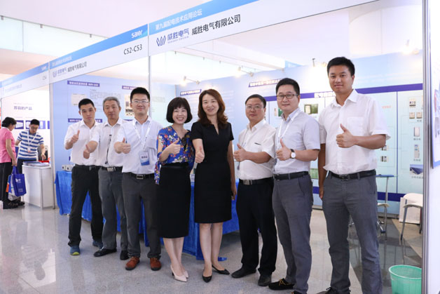 【威勝電氣董事長(zhǎng)曹朝輝女士,總裁助理、電網(wǎng)銷售中心總經(jīng)理張蓓女士與參展工作人員合影】